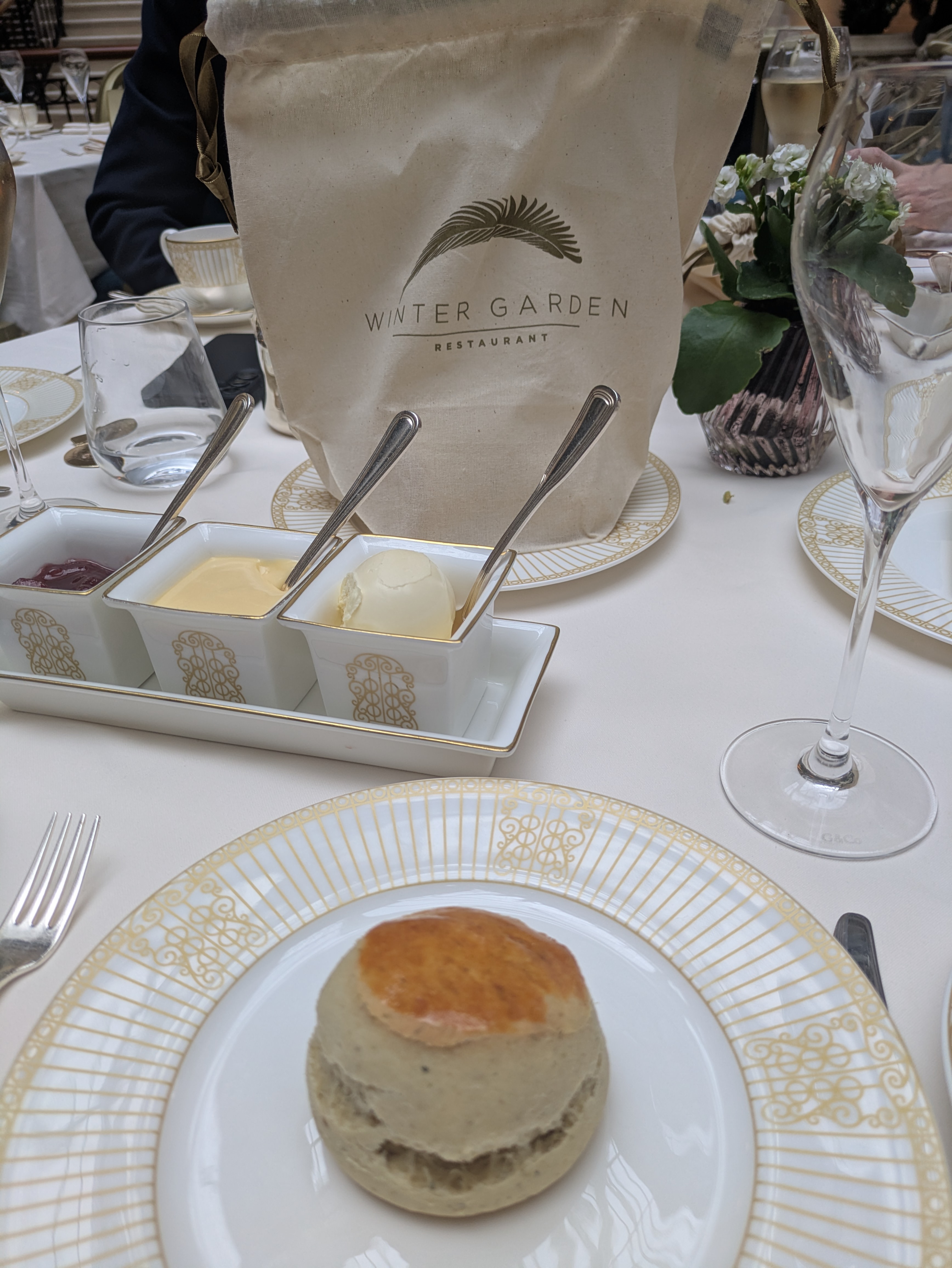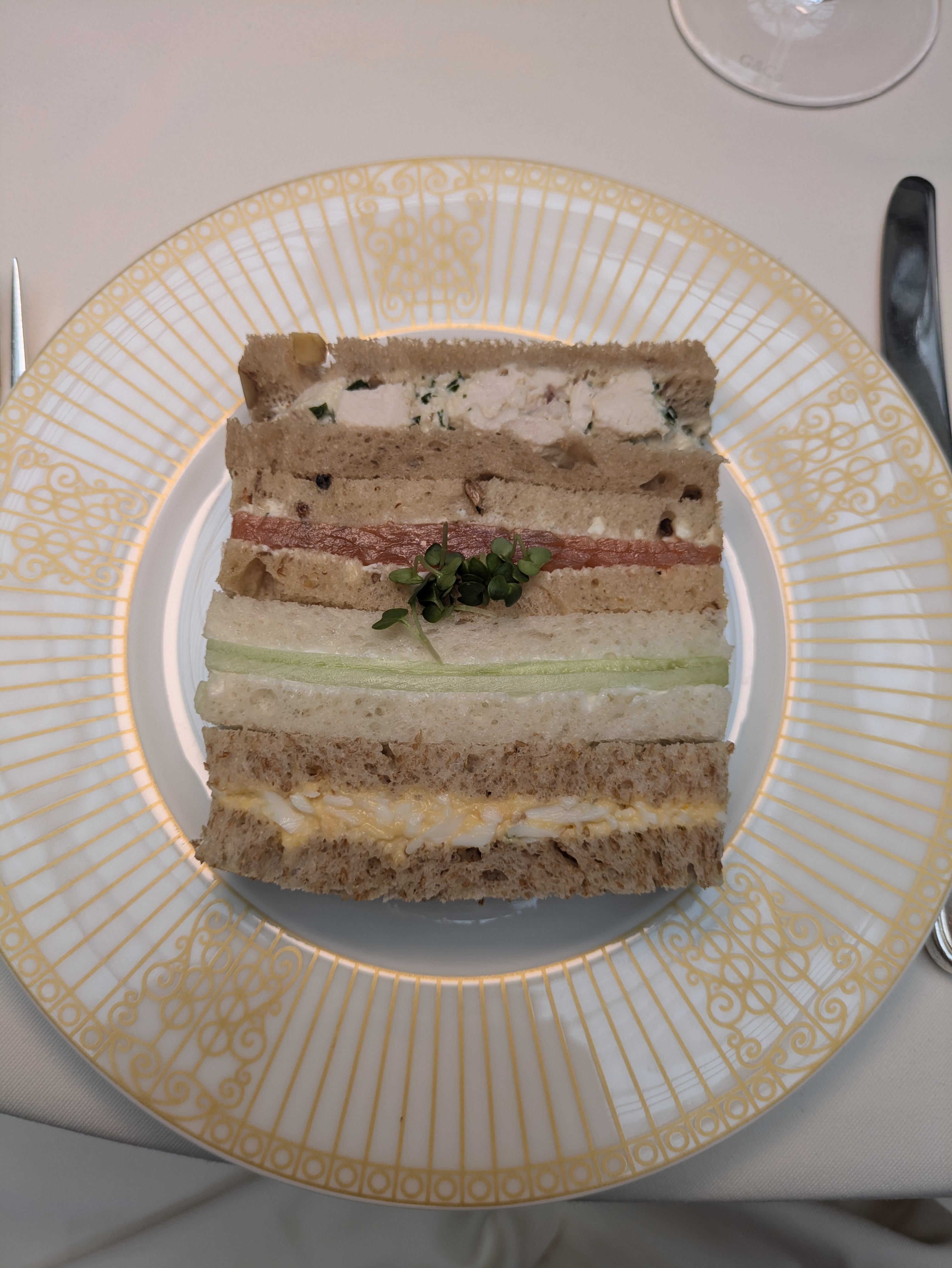 The sandwich selection arrives first, each cut with elegant precision. Our table’s favourite was the sage chicken with herb mayonnaise and crème fraiche on walnut bread. The others were a truffled egg and mayonnaise with chives, Scottish salmon with horseradish cream and finally the classic cucumber.