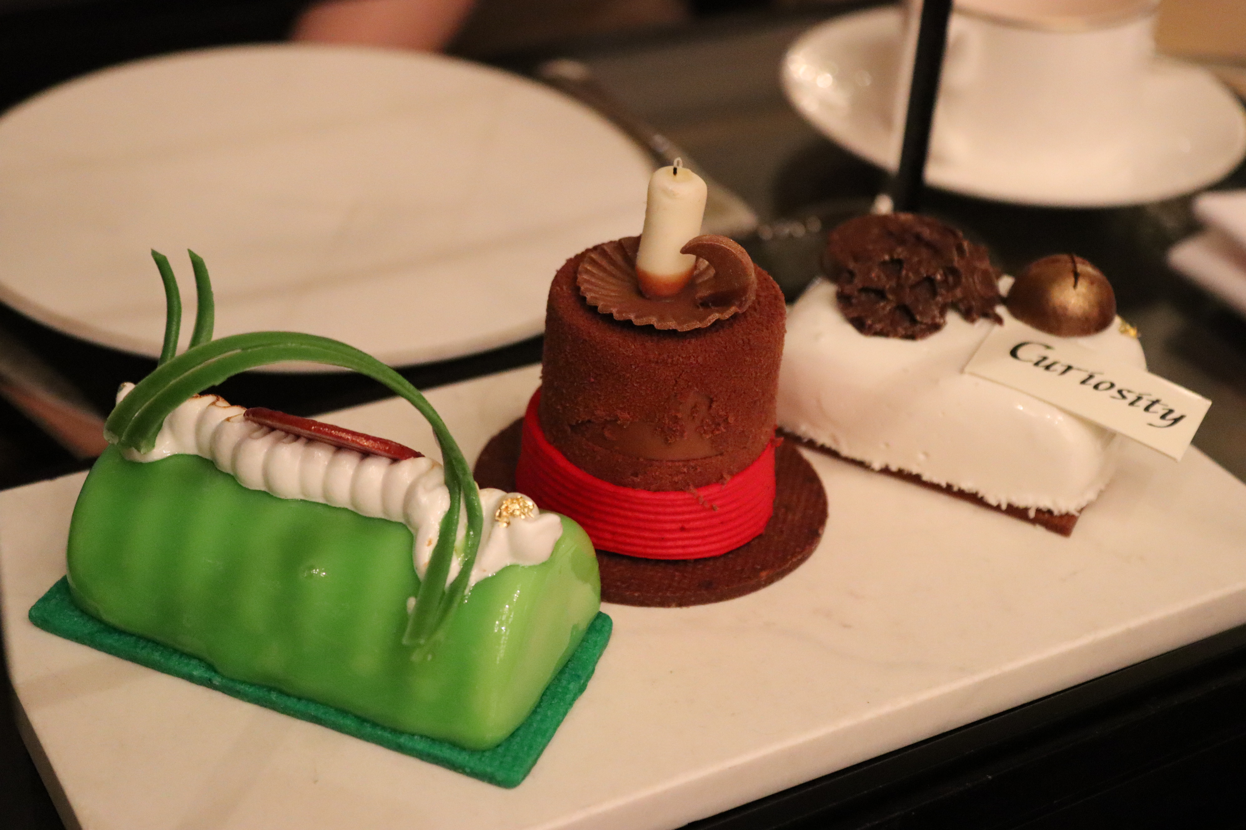 The arrival of plain and raisin scones then follow, freshly baked in Rosewood’s pastry kitchen. Light and delicately crumbed, they are served warm with Cornish clotted cream, homemade lemon curd, and English strawberry jam, demonstrating of tradition of the experience before moving fully into the artistic heart of the Afternoon Tea.