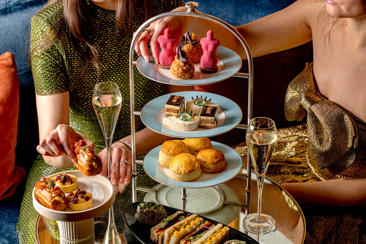 The savoury selection offers an expressive mix of both classic and whimsical elements. From cucumber, dill and cream cheese on black sesame charcoal brioche to roasted red pepper with hummus and black olive crumble, alongside coronation chicken with apricot, and a beetroot, pecan and goat’s cheese tart, complemented by the chef’s seasonal ever-changing savoury creation.