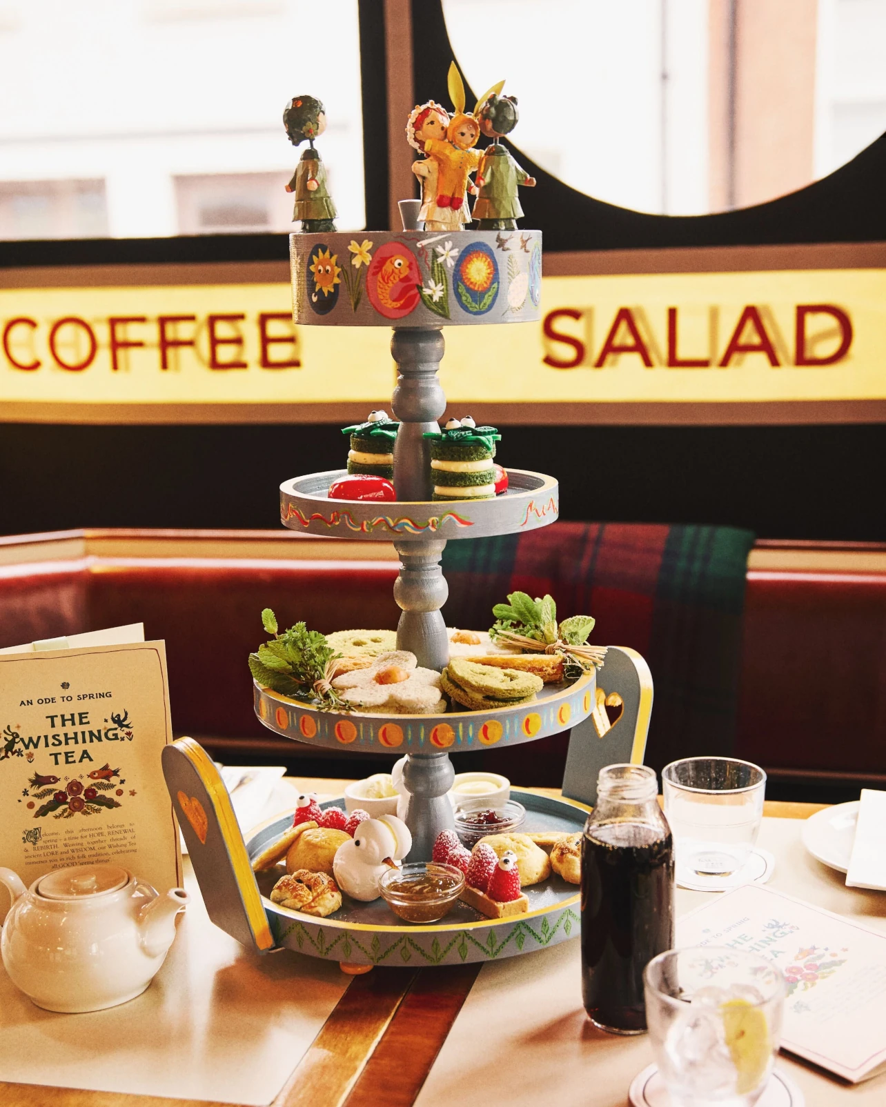 The cafe is serving a menu steeped in tradition on beautiful bespoke stands – wooden art works which spin springtime yarns with characters who step straight from folk tradition and come to life at your table. Every detail is steeped in ancient wisdom. It’s a really beautiful experience with delicious cakes, including the new Green Man nettle cake, a meringue chick, raspberry caterpillar tart and a selection of scones, sandwiches, eccles cakes and pikelets.