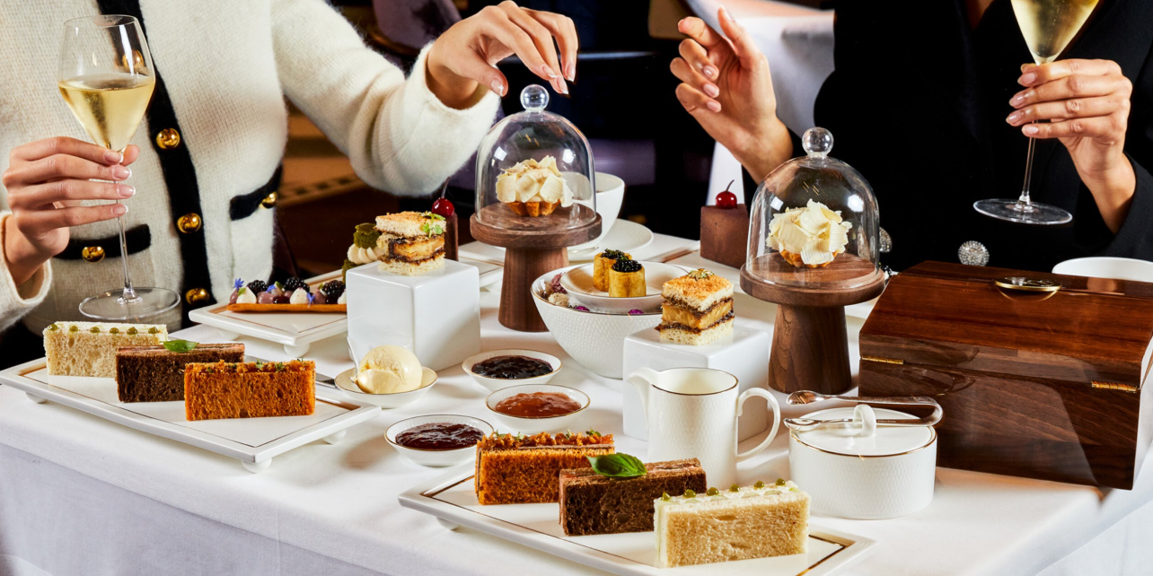 Harrods’ Festive Afternoon Tea at The Georgian features seasonal savouries such as a confit turkey tart with mulled cranberry and sage–onion–bacon crumb, a brown-butter crumpet topped with Oscietra caviar, cucumber with minted cream cheese, Faroe Island smoked salmon with horseradish, and spiced confit duck with black garlic and mango chutney. Warm plain and fruit scones arrive with clotted cream and house preserves, followed by patisserie including a Citrus Chocolate Délice, a chestnut Mont Blanc, Cherry & Almond Choux and a Gingerbread & Pear Gâteau. From £82 per person.