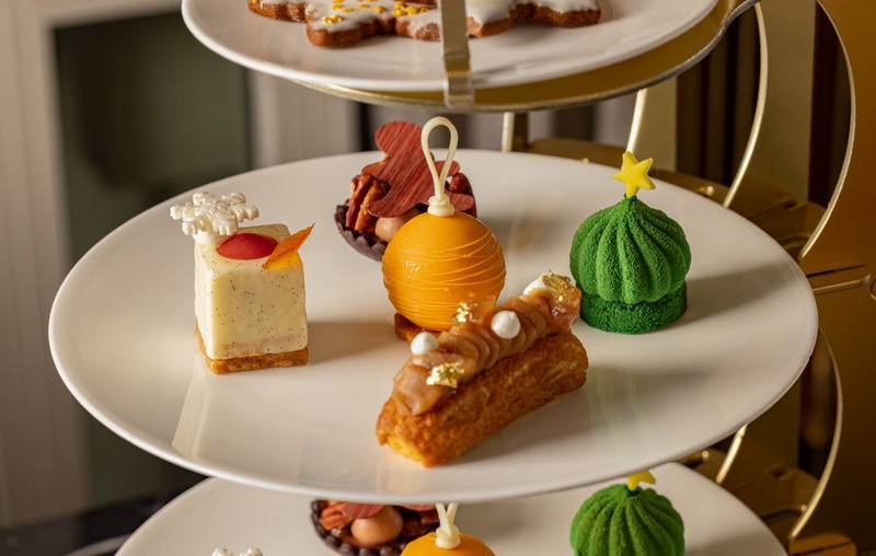 Our cake stand brings the season to life: orange cheesecake, chestnut éclair, dark chocolate tartlet, a festive bauble of mango and ginger, and a pistachio Christmas tree with yuzu and mandarin. Each piece is handcrafted by our pâtissiers and finished with a playful chocolate fondue.