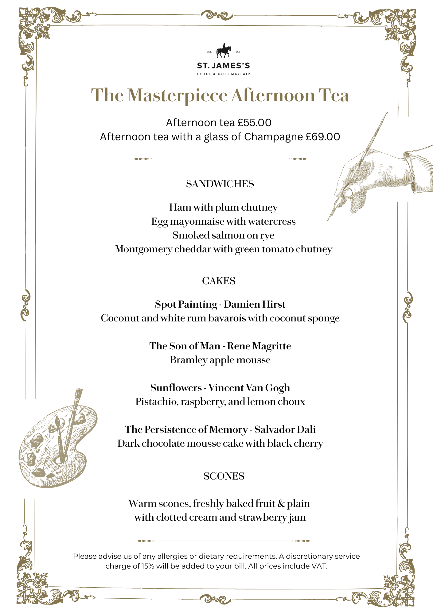 Indulge in an exquisite Afternoon Tea celebrating iconic artists with art-inspired pastries that pay homage to Damien Hirst, René Magritte, Vincent van Gogh, and Salvador Dalí. These delights are served alongside our signature warm, freshly baked scones with rich clotted cream and sweet strawberry jam, plus a selection of traditional sandwiches. Join us for an afternoon as if you were in a gallery.