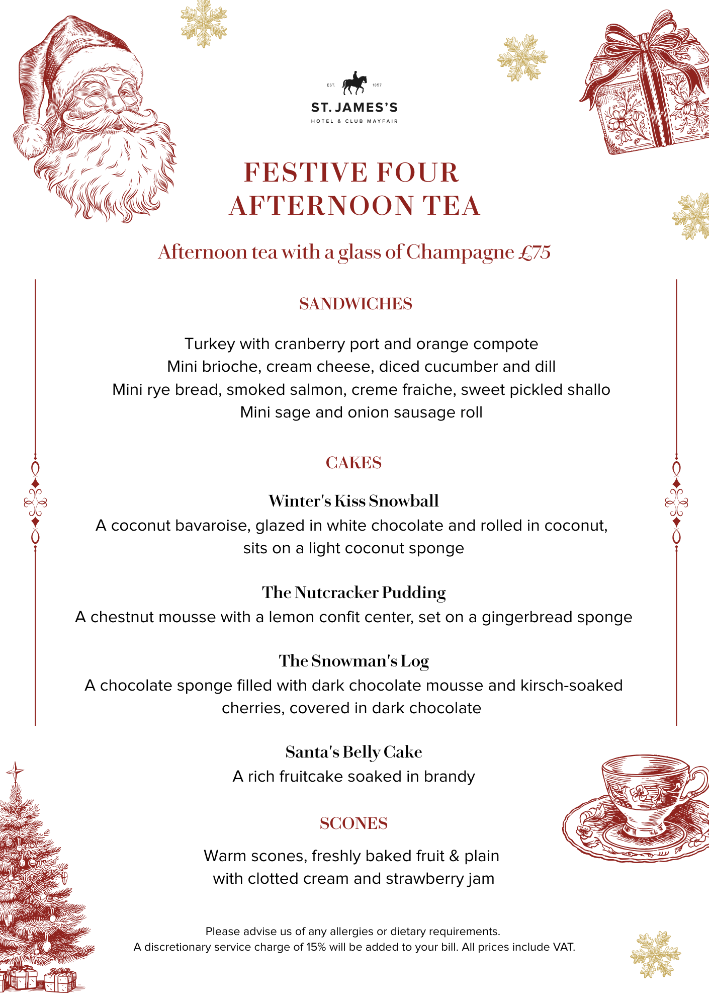 Indulge in holiday-inspired sandwiches and delightful cakes, including their brand new "Winter's Kiss Snowball" and "Nutcracker Pudding". Served with freshly baked scones and a complimentary glass of champagne.