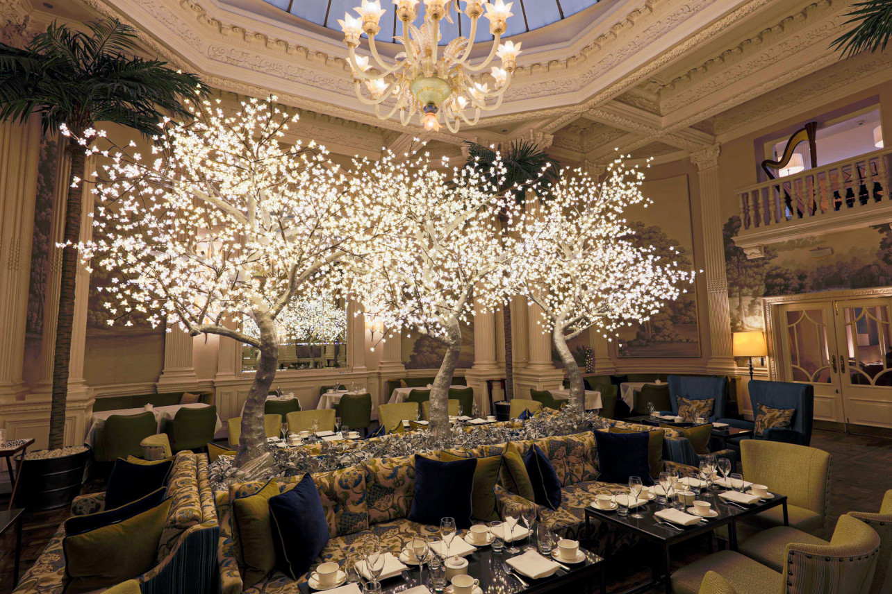 Palm Court's glass-domed ceiling and Venetian chandelier provide a relaxed yet grand setting beneath the green palm trees. During Afternoon Tea, live harp music from the balcony fills the air with gentle melodies, creating a serene atmosphere.