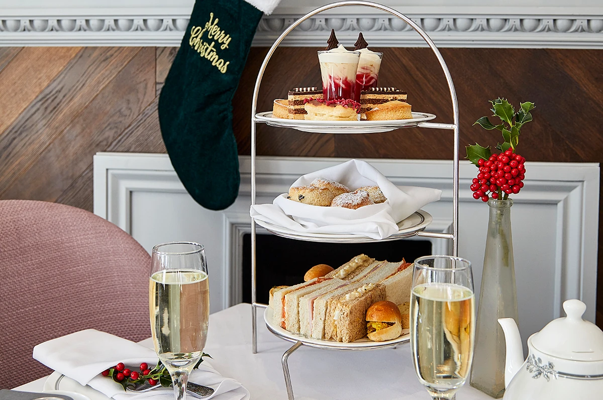Using the finest quality ingredients, Burnham Beeches Hotel handcrafts a mouth-watering selection of sandwiches, such as turkey and cranberry & smoked salmon and cucumber. Freshly baked scones, and festive cakes including clementine, raspberry and meringue tartlet, 'Ho, Ho, Ho' eclair and a chocolate and Baileys Opera cake.