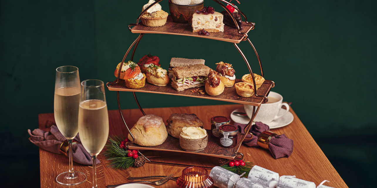 This Festive Afternoon Tea brings a seasonal stand of savoury bites including truffle egg mayo in a brioche roll, a pig-in-blanket brioche with mustard aioli, a plant-based smoked Applewood with plum and apple chutney sandwich and a roast turkey and cranberry sandwich with a Brussel sprout slaw.