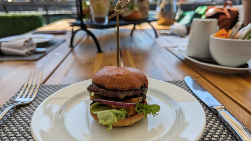 We made our tea selections, and it was promptly served to us in teapots. First up was the savoury course. We started with the prawn cocktail, generously sized but light. The savouries were a great balance between traditional Afternoon Tea flavours, like the egg and cress roll, and exciting new flavours like the Thai sticky beef and sesame wrap. We saved the mini slider until last, and it packed a lot of flavour and was juicy and well-seasoned. The Pescatarian offering enjoyed a moreish humous with pita bread dippers as well as a delicious vegetarian slider.