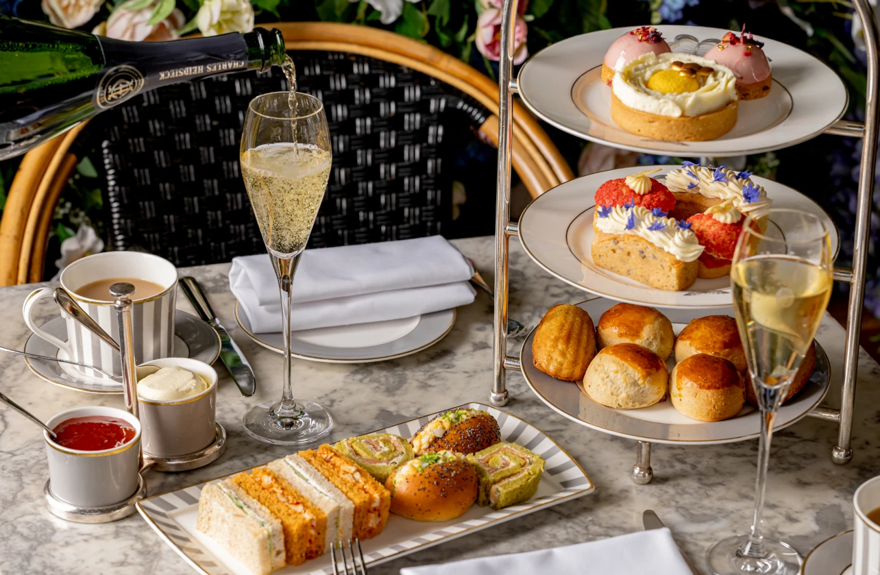 Our Afternoon Tea menu features a selection of delicate sweets, including Earl Grey cake, rhubarb and hibiscus profiteroles, passion fruit and mango tarts, raspberry and rose mousse, and orange blossom madeleines. Savoury highlights include smoked salmon pinwheels, harissa chicken mayonnaise, and marinated cucumber with cream cheese. To finish, enjoy freshly made vanilla and sultana buttermilk scones, served with Cornish clotted cream and a unique rhubarb and Campari jam