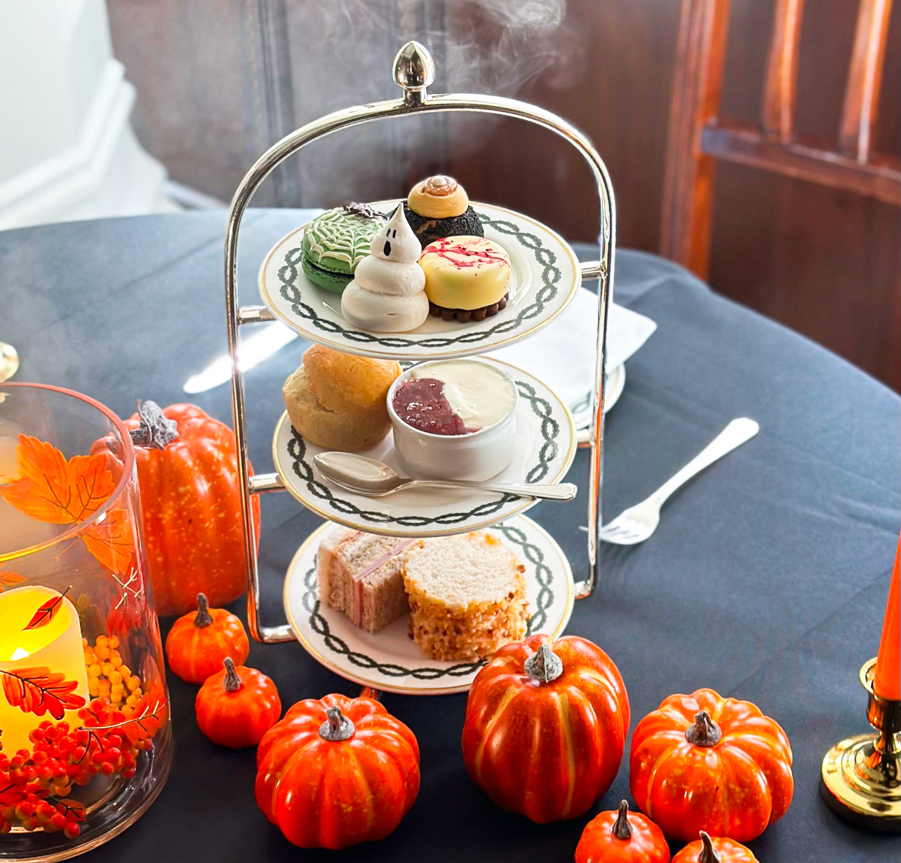 Freshly baked plain scones with Cornish clotted cream and homemade strawberry preserve follow, before a trio of Halloween-inspired sweets: pumpkin spice & white chocolate blondie, dark chocolate & raspberry choux, and a candy apple macaron.