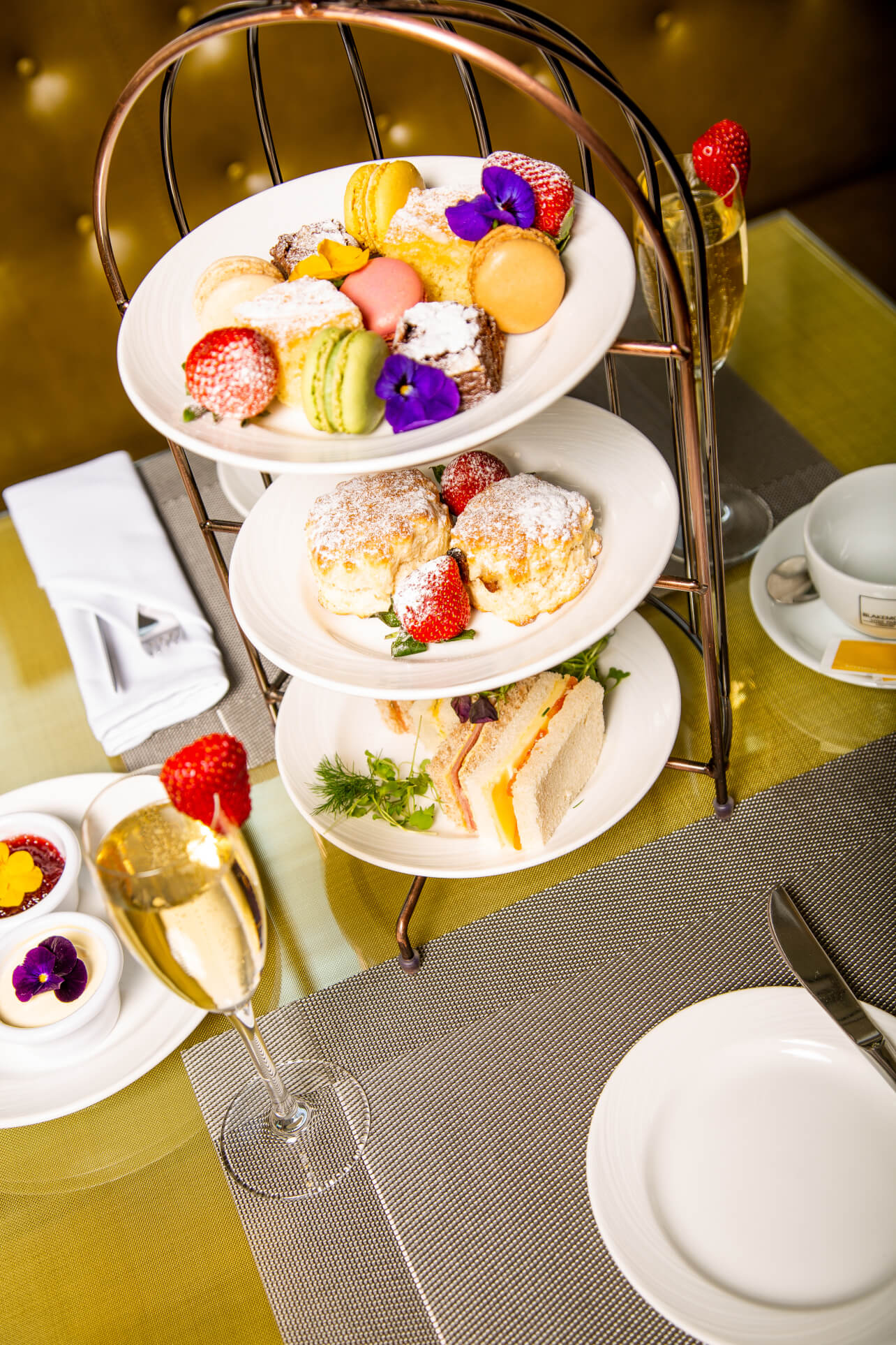 Indulge in a Traditional Afternoon Tea with a glass of Prosecco or Champagne, featuring elegant finger sandwiches, warm classic scones served with clotted cream and jam, followed by a selection of cakes and desserts.