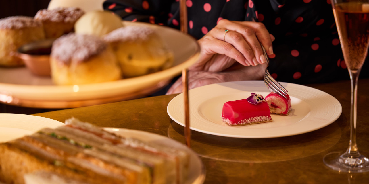 The patisserie selection features rhubarb and strawberry gâteau roulé, Kent mango and mint with ivory chocolate crème and indulgent Charbonnel et Walker truffles, including Pink Marc de Champagne and Dusted Milk Sea Salt Caramel varieties.